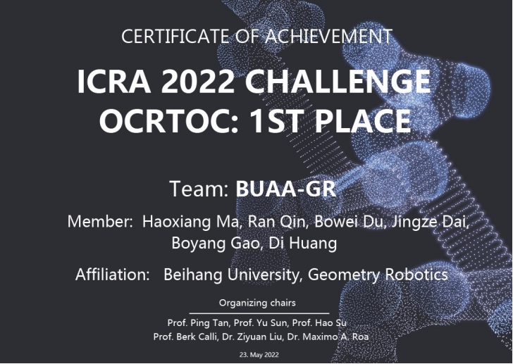 在刚刚结束的IEEE International Conference on Robotics and Automation (ICRA 2022)机器人抓取与操作比赛开放云赛道 (OCRTOC) 上,北航beat365中文官方网站参赛团队(1名本科生、2名硕士生、1名博士生)在8个国家的24支参赛队伍中排名第1,获得冠军。
