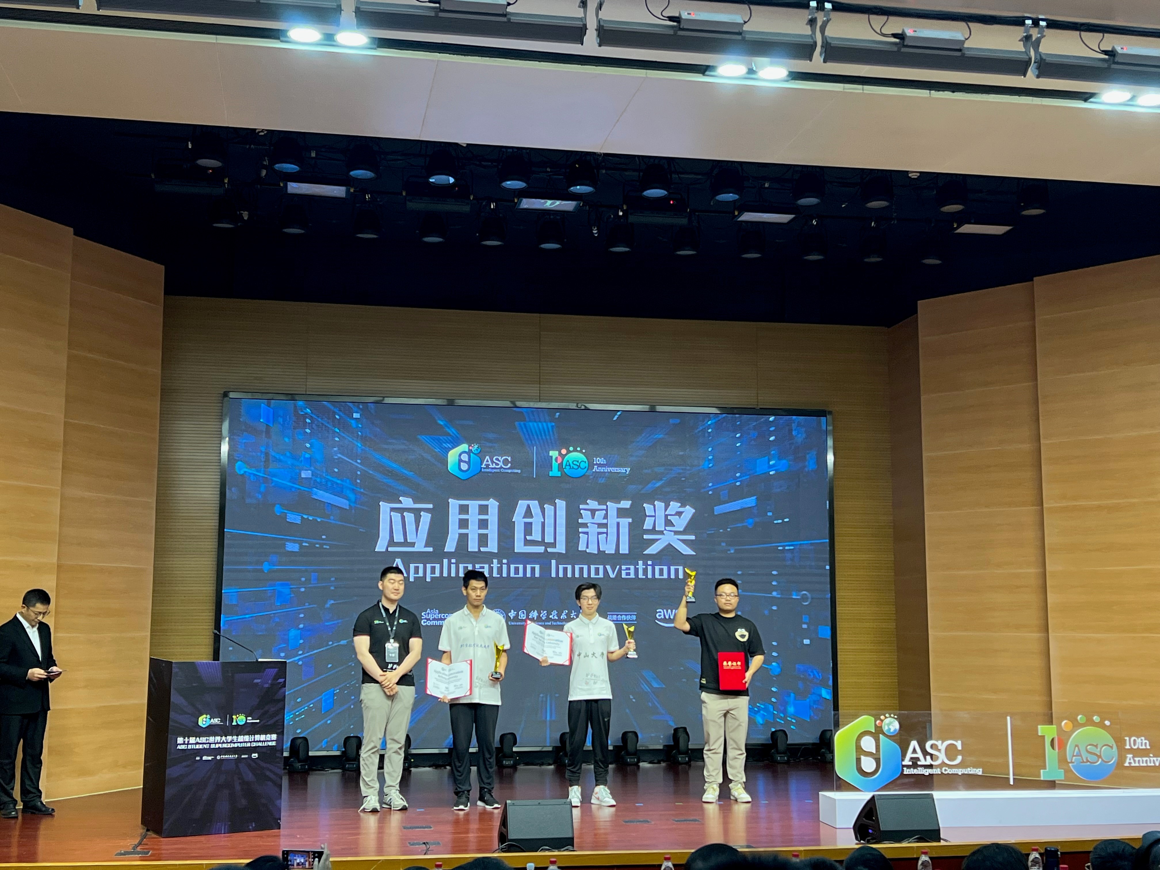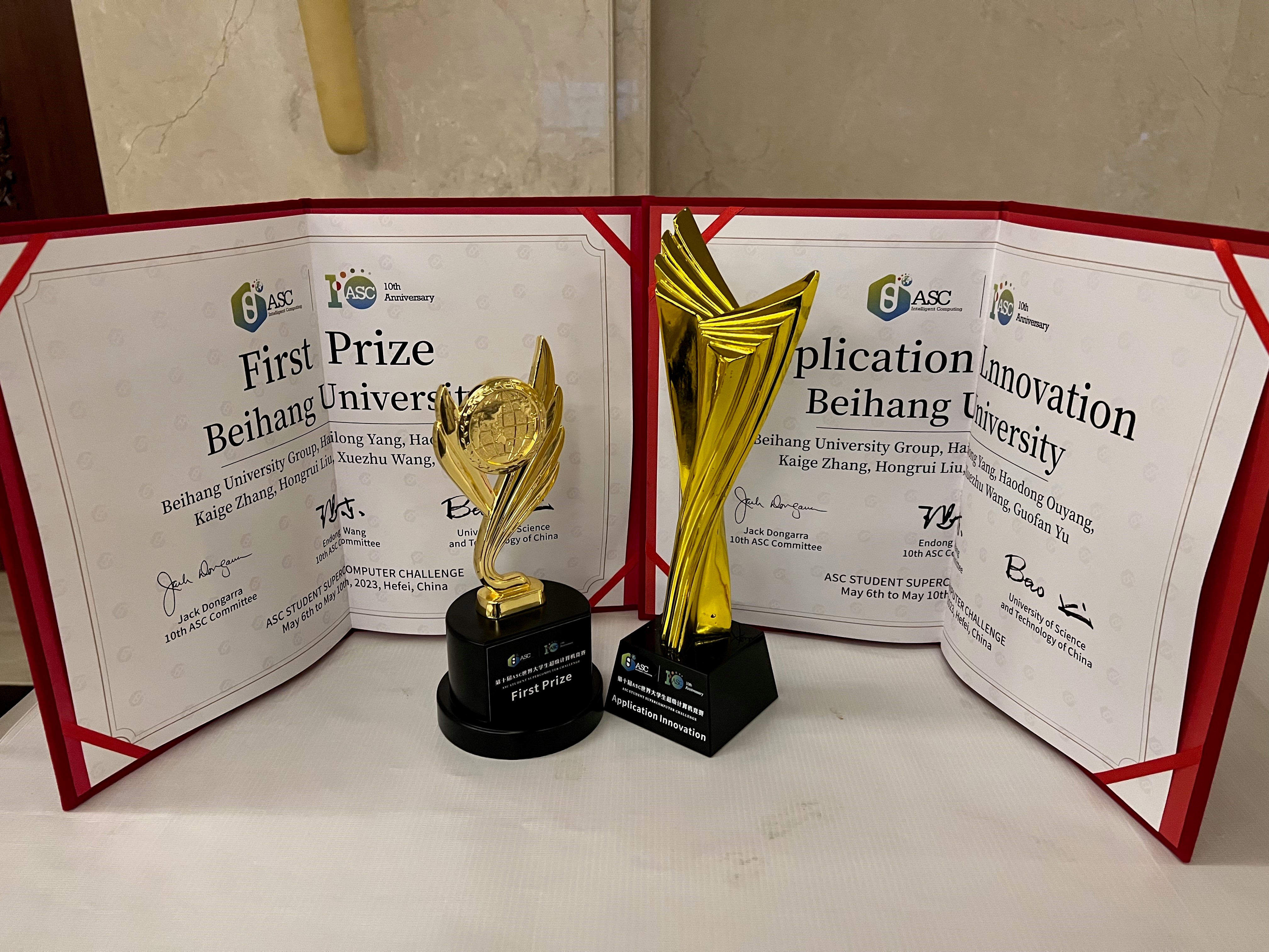 5月10日全球规模最大的世界大学生超级计算机竞赛(ASC)总决赛在中国科学技术大学落下帷幕,在北航beat365中文官方网站杨海龙副教授的悉心指导下,由来自beat365中文官方网站的五名本科生参赛队员欧阳皓东(队长)、刘鸿睿、余国帆、张凯歌、王雪竹,以及五名观摩队员仲书璋、杜劭康、吴飞扬、孔昊然、安达楷组成的北航超算队在分子动力学模拟deepMD、海洋数值模拟FVCOM等多道赛题中取得了优异成绩。最终,北航超算队荣获第十届ASC全球总决赛一等奖和应用创新奖。这是北航超算队第九次获得ASC全球总决赛一等奖,彰显了北航本科生扎实的计算机系统结构知识和优秀的超算创新能力,也是beat365中文官方网站对“教赛研”相结合的新工科培养模式的成功探索。