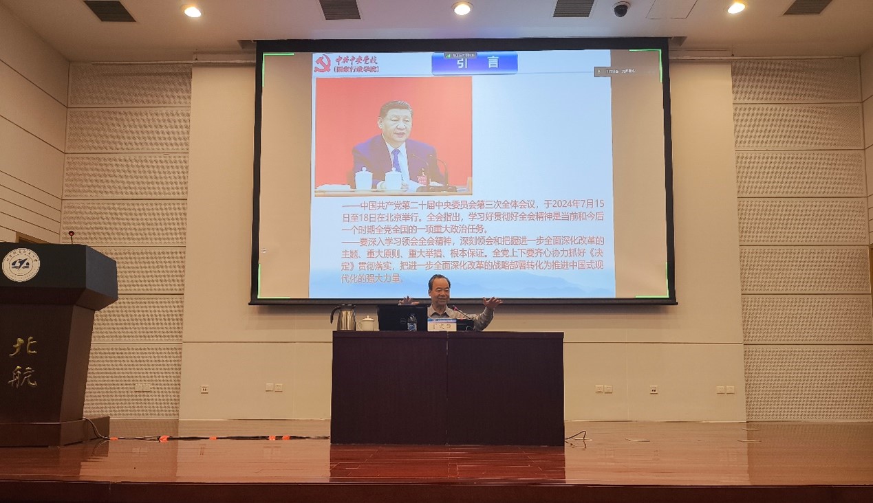 丁文锋教授在报告中指出,党的二十届三中全会的胜利召开,展现了党中央高举改革开放旗帜不动摇的决心,指明了我国在未来几年经济、政治、文化、社会、生态文明、国防等方面的总体改革方向和具体改革任务。报告由三个方面组成:一是对比新时代以来历次党的全国代表大会,详细分析了党的十八大、十九大、二十大精神的发展脉络;二是介绍了自改革开放以来的多个具有里程碑意义的三中全会,详细讲述了自十一届三中全会以来,中国共产党解放思想、实事求是,推进改革开放事业不断发展,推动中国式现代化进程不断向前;三是介绍了党的二十届三中全会的主题主线、主要内容,重点分析了构建支持全面创新体制机制的意义和举措。