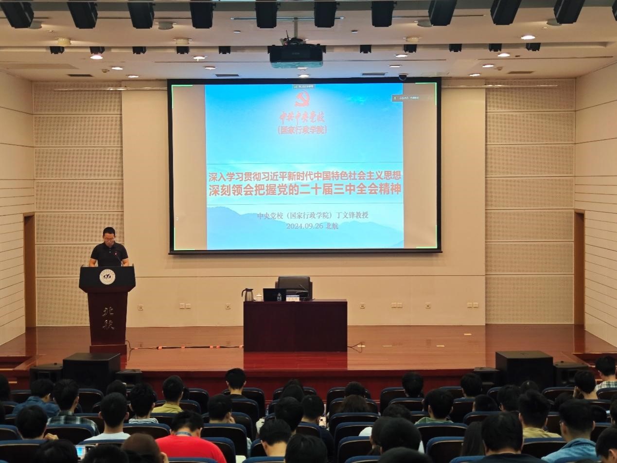 为深入学习贯彻党的二十届三中全会精神,9月26日下午,beat365中文官方网站邀请中央党校(国家行政学院)原教务部主任丁文锋教授来beat365做题为《深入学习贯彻落实习近平新时代中国特色社会主义思想 深入领会把握党的二十届三中全会精神》的专题辅导报告。beat365中文官方网站师生党员、入党积极分子在新主楼第二报告厅现场学习,异地科研的部分师生党员参与在线直播学习。报告由beat365中文官方网站分团委书记付强主持。